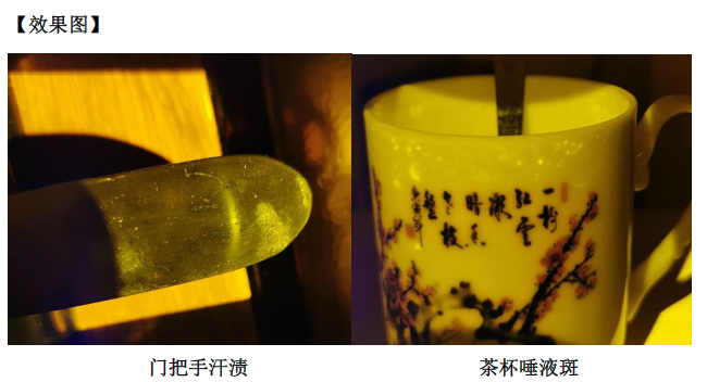 本設備適用于現場大范圍無損搜索各類生物物證,如:唾液斑、精斑、指甲、牙齒、骨骼碎片及涂料墻上指紋等。無需進化學預處理,可以保證物證客體信息的真實性、完整性及生物活性;尤其對微量物證比其他光源有更好的發現效果。